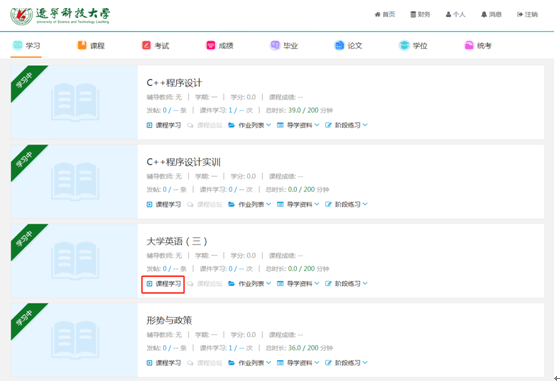 1、登錄后,進(jìn)入主頁面,找到學(xué)習(xí),然后選擇課程學(xué)習(xí)。