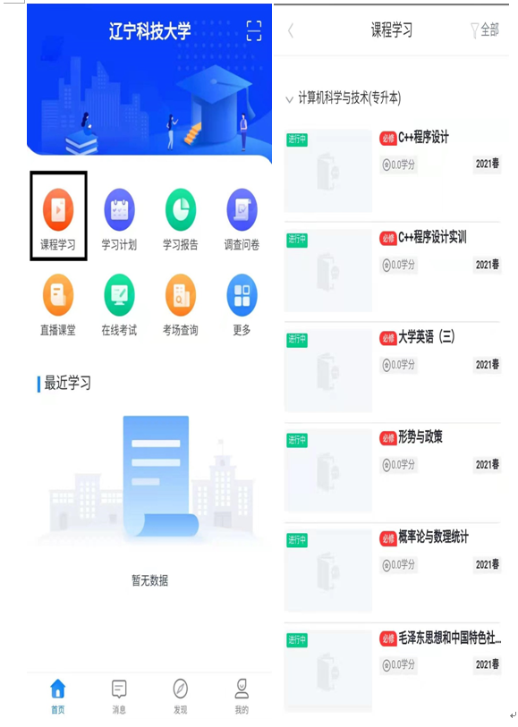 3、選擇課程學(xué)習(xí),進(jìn)入課程界面,2021春為本學(xué)期要學(xué)習(xí)的課程。