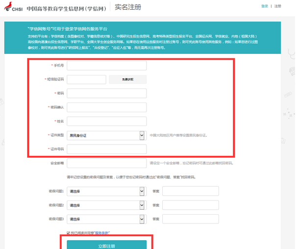 注冊頁面:只需填寫紅框里的內(nèi)容,建議用學(xué)生本人手機(jī)號(hào)。