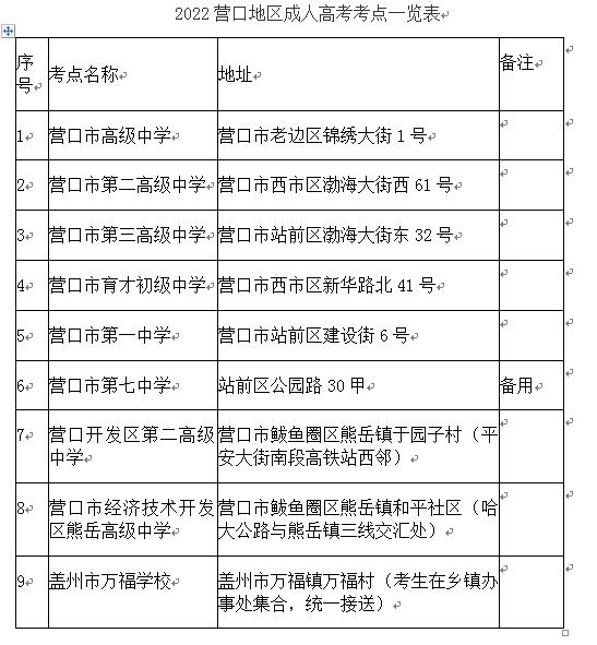 1.在原有營(yíng)口市內(nèi)考區(qū)和鲅魚(yú)圈考區(qū)的基礎(chǔ)上,增設(shè)蓋州市考區(qū),設(shè)蓋州市萬(wàn)福學(xué)校考點(diǎn)。