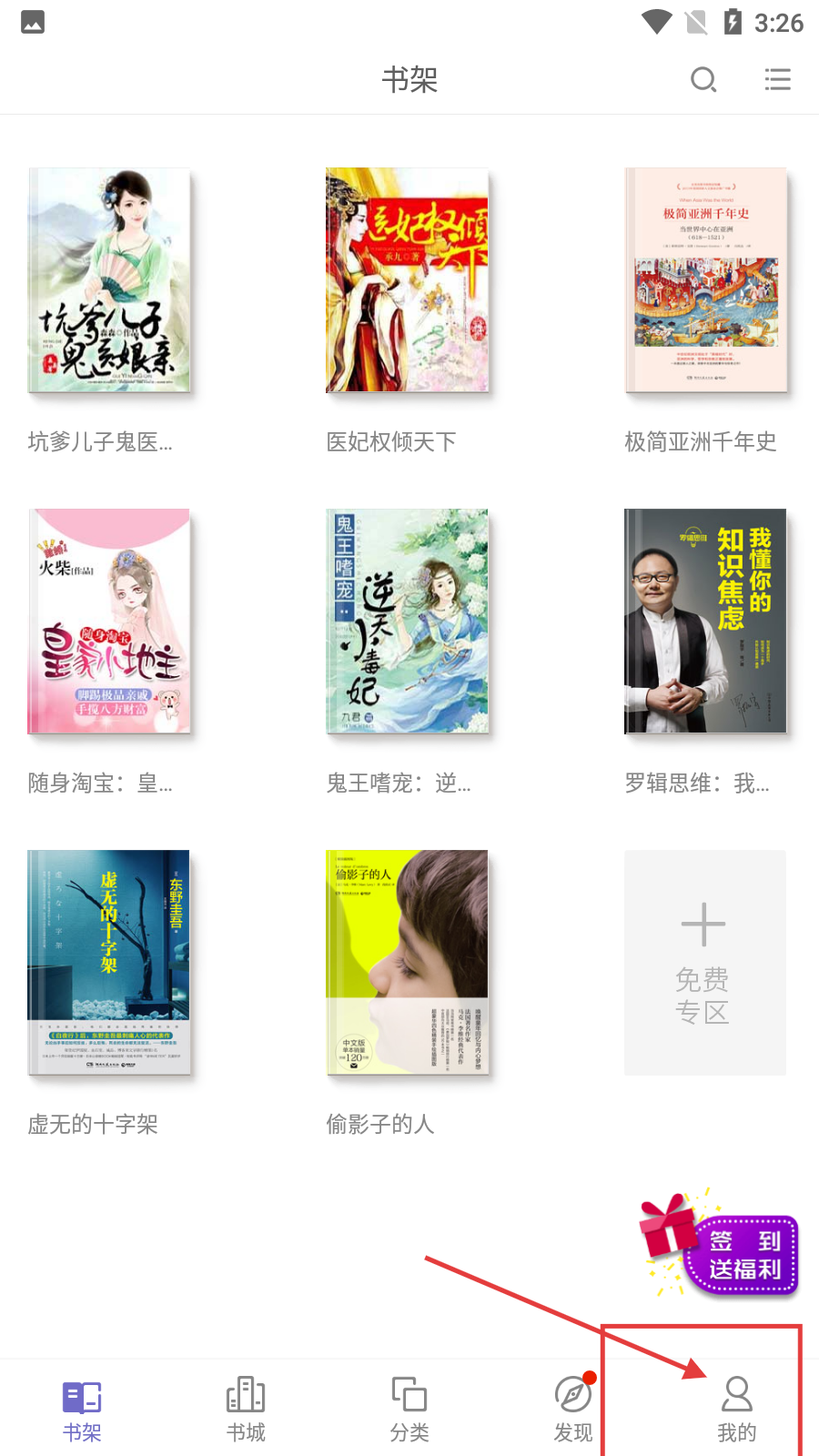2、在書架頁面,點(diǎn)擊底部導(dǎo)航欄最右側(cè)的【我的】選項(xiàng)。