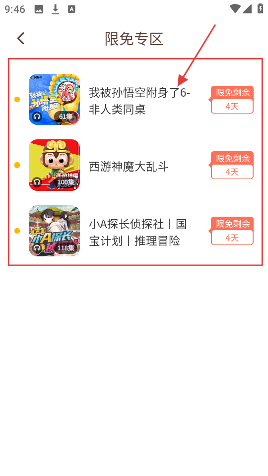 2、進入限免專區(qū)后,我們可以看到《我被孫悟空附身了6-非人類同桌》等限免故事,挑選想收聽的故事。