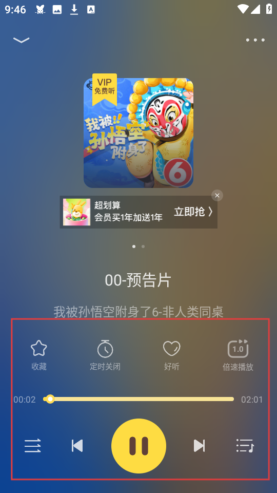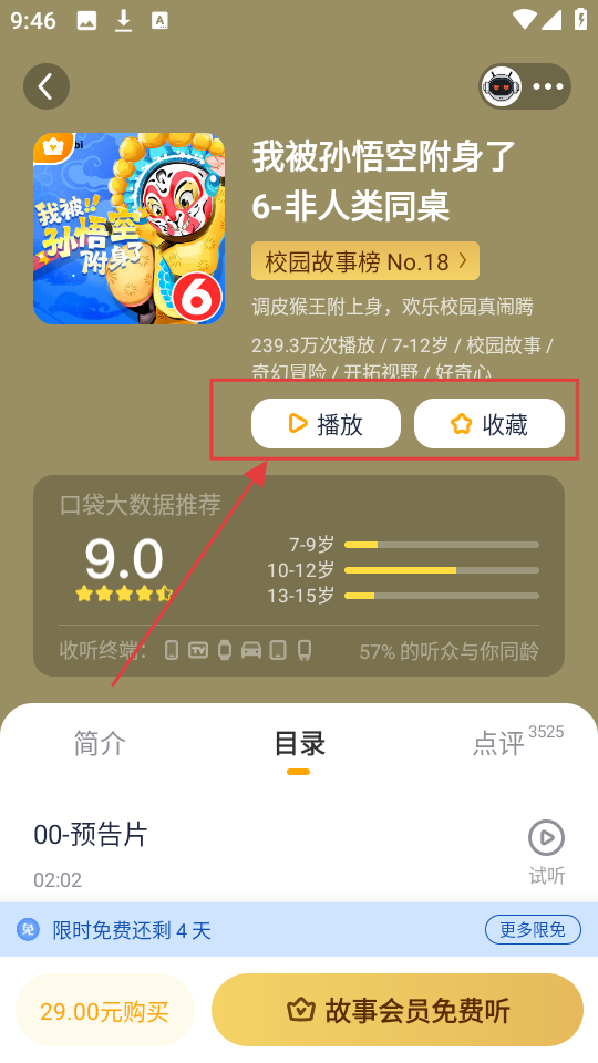 3、挑選好限免故事(如《我被孫悟空附身了6-非人類同桌》)后,點擊【播放】,就能開始收聽故事啦。