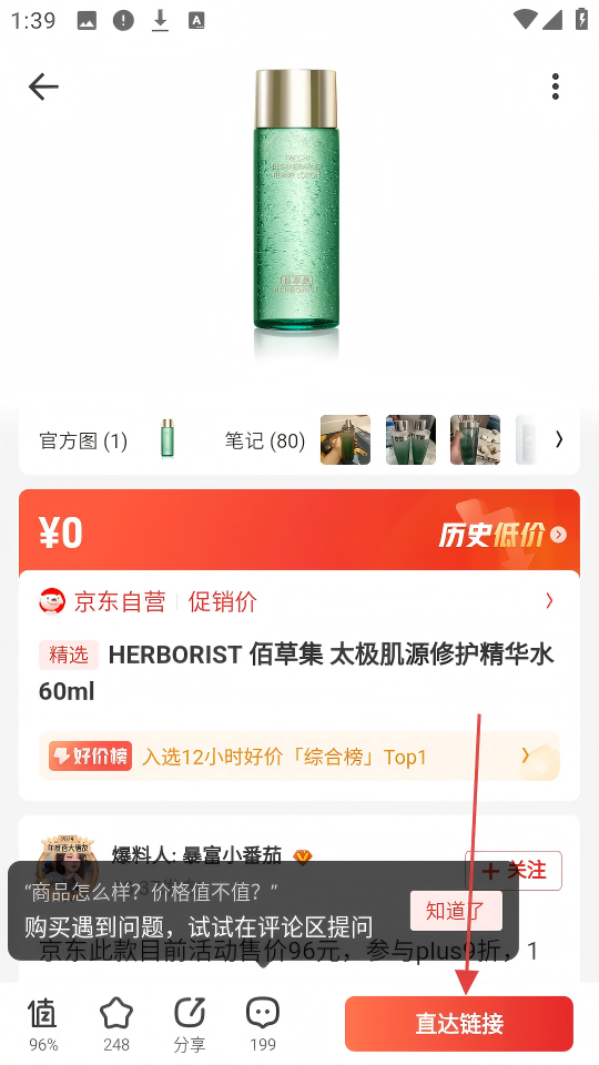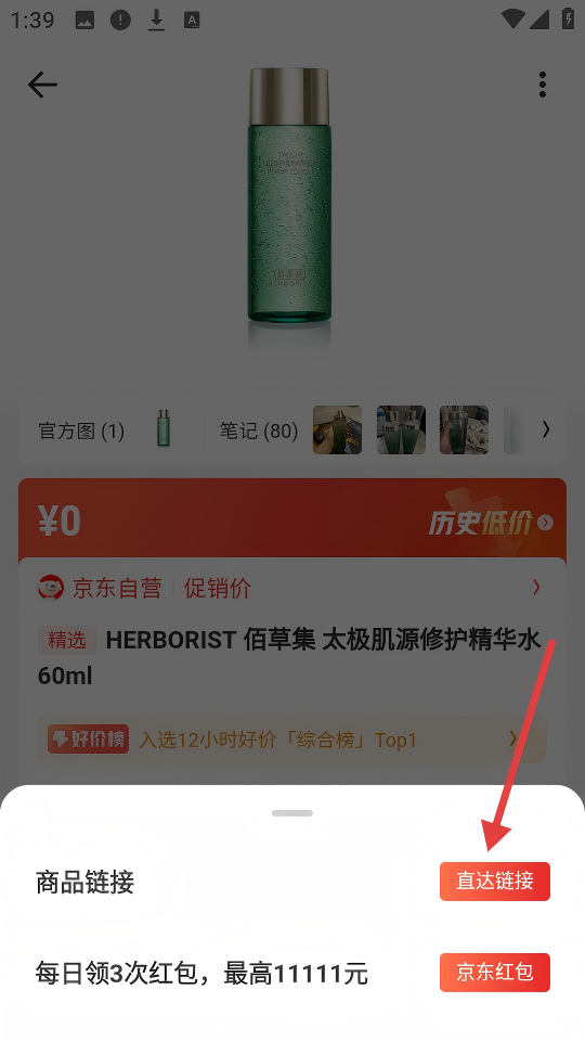 4、點(diǎn)擊【直達(dá)鏈接】可進(jìn)入HERBORIST佰草集太極肌源修護(hù)精華水60ml的商品頁(yè)面。
