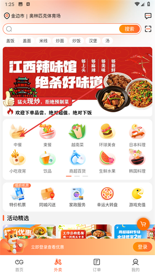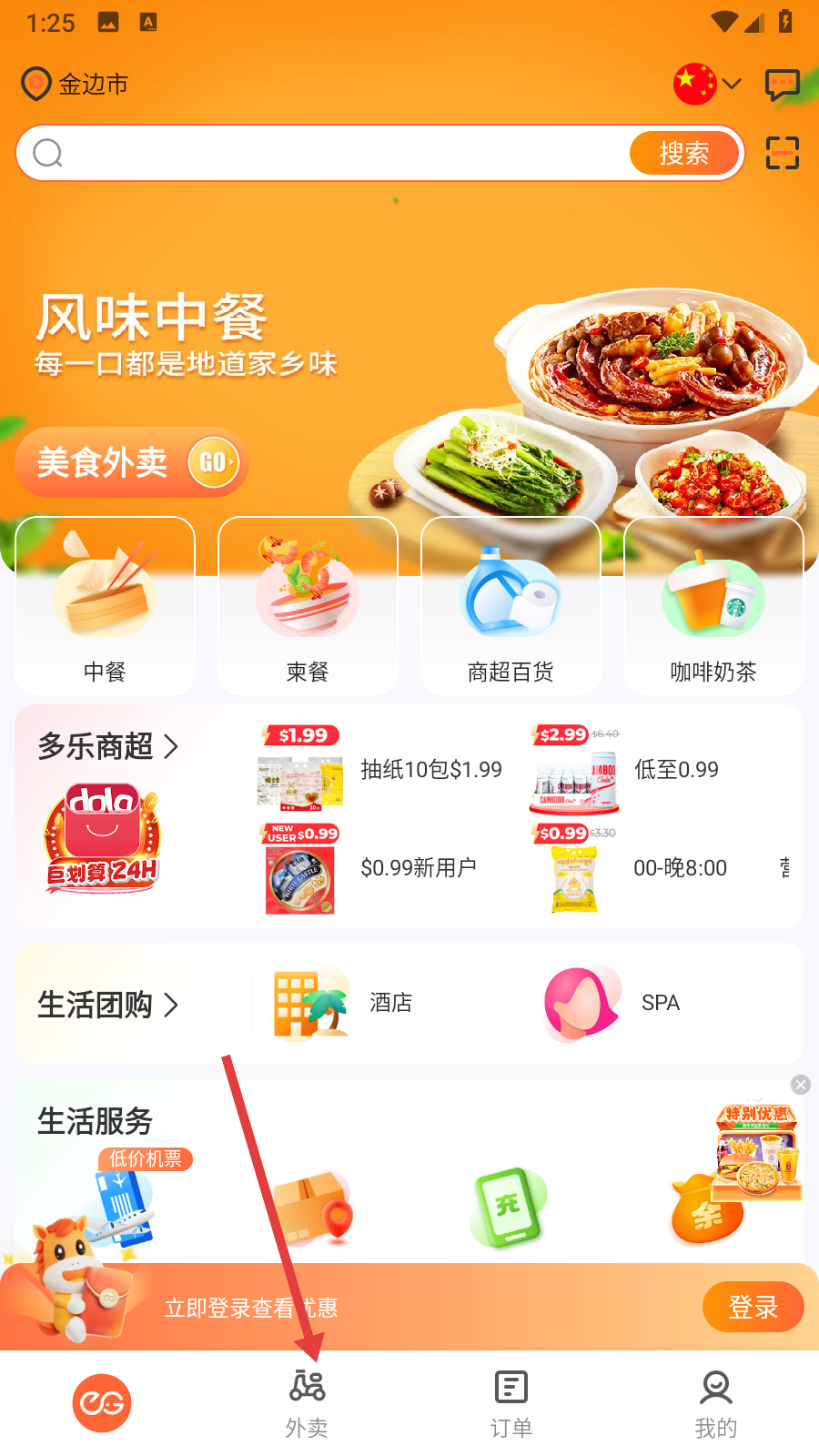 1、點擊底部紅色箭頭指向的【外賣】按鈕進入外賣頁面。