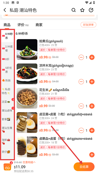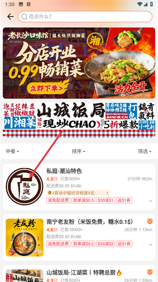 3、在中餐列表中點擊紅色箭頭指向的【私庭·潮汕特色】店鋪圖標(biāo),進入店鋪頁面。