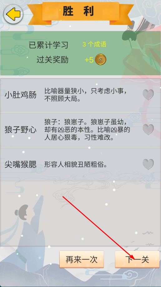 4、通關(guān)后,點(diǎn)【下一關(guān)】,解鎖新關(guān)卡,累計(jì)學(xué)習(xí)更多成語。