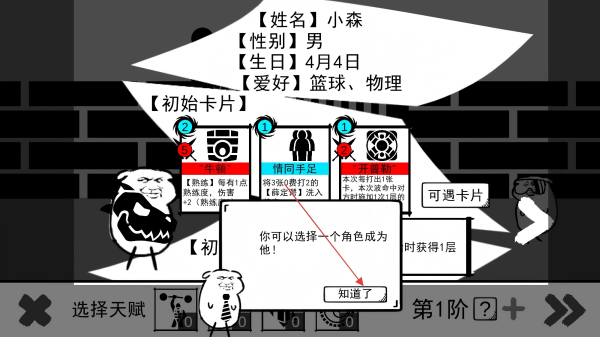 2、角色創(chuàng)建選小森,看初始卡片,點【知道了】,確認角色信息。