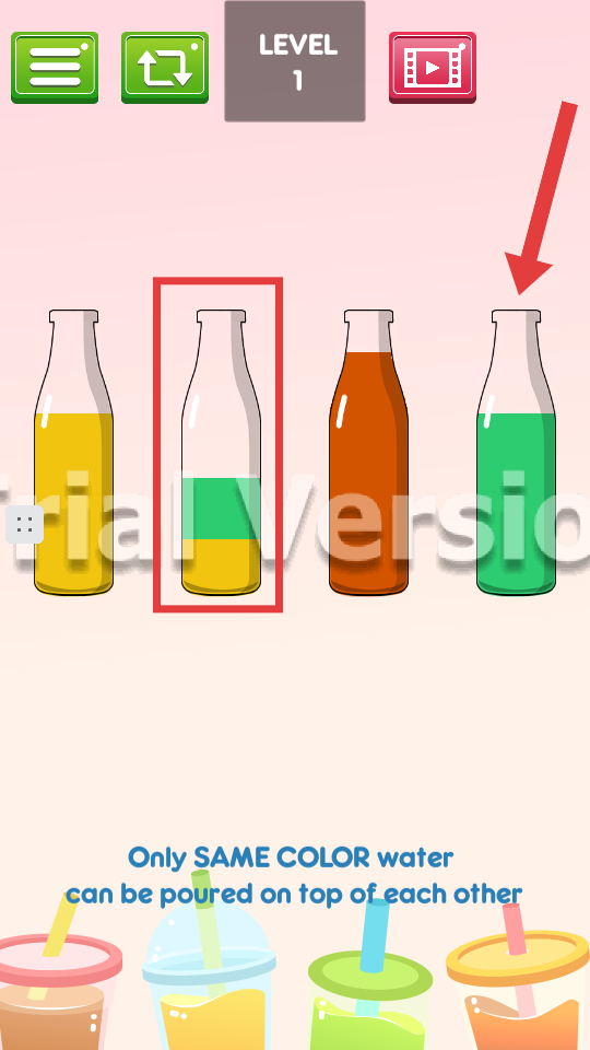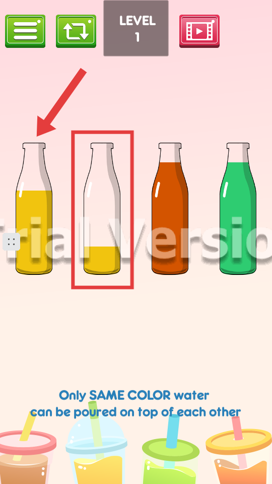 2、進入【LEVEL1】關(guān)卡后,觀察紅框內(nèi)瓶子的液體情況,將方框內(nèi)瓶子液體倒入箭頭所指的瓶子。