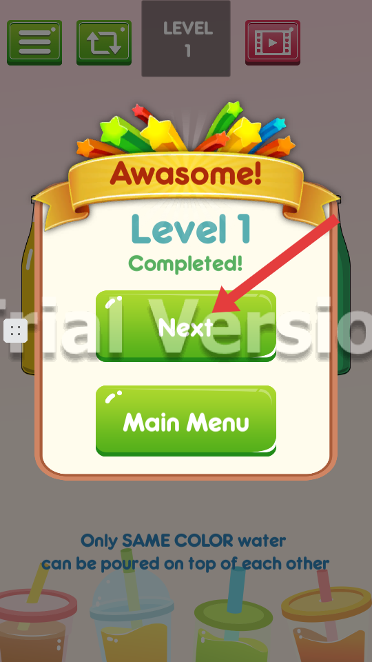 4、成功將所有液體按顏色分類整理后,出現(xiàn)【Awasome!】提示,點擊【Next】按鈕,挑戰(zhàn)下一關(guān)。