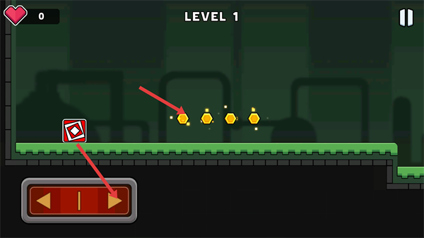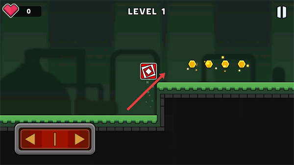 1、在【LEVEL-1】中,通過下方左右箭頭按鈕控制紅色方塊移動,收集場景中的金幣。