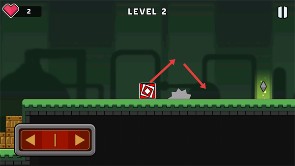3、當(dāng)遇到尖刺障礙物時(shí),點(diǎn)擊屏幕讓紅色方塊越過障礙物,繼續(xù)向前闖關(guān),收集綠色圖形。