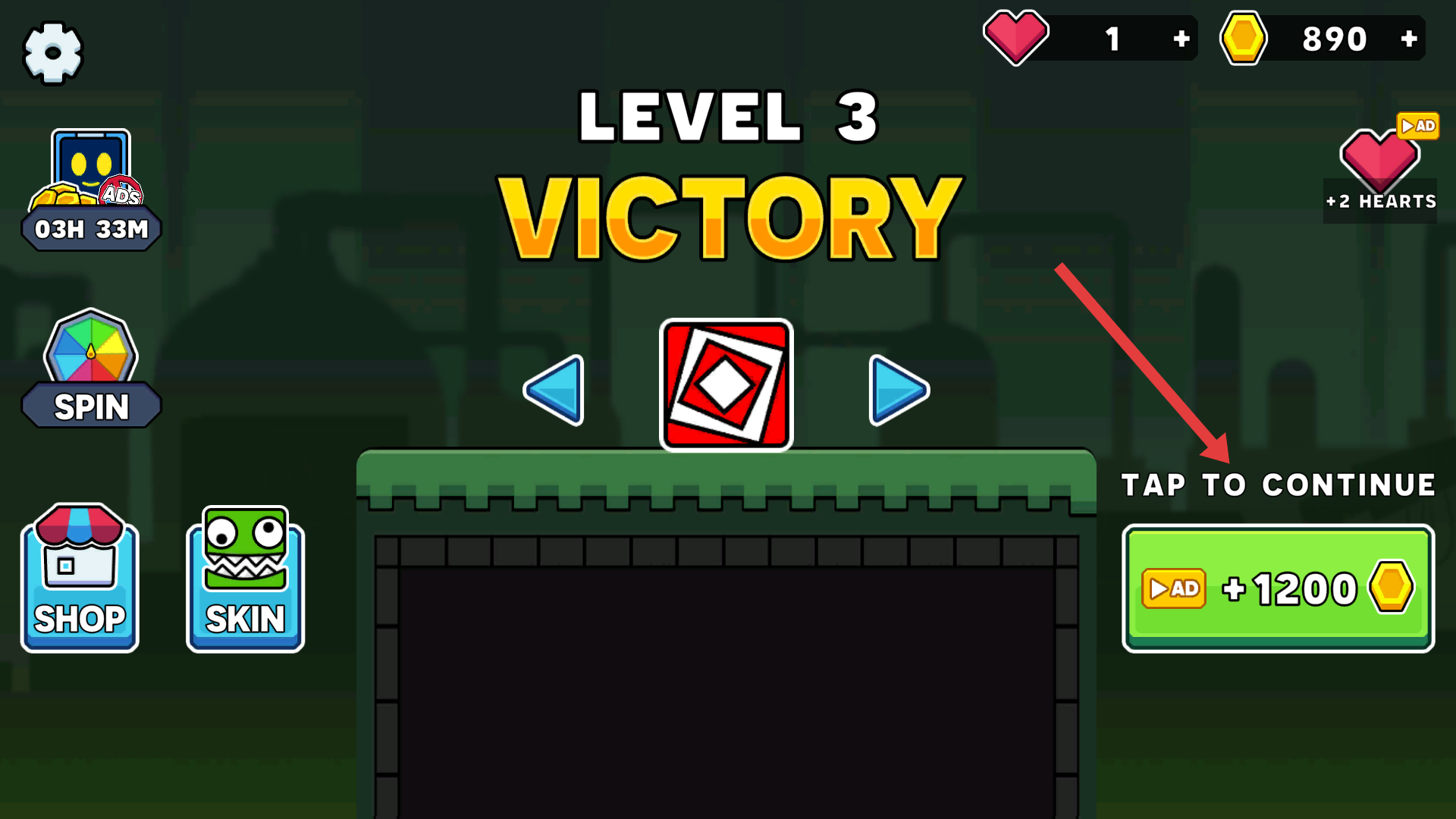 4、闖關(guān)勝利后,可點(diǎn)擊【TAP-TO-CONTINUE】繼續(xù)游戲,也能選擇觀看廣告,獲取+1200的金幣獎勵。