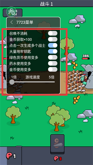 3、開啟內(nèi)置菜單,可開啟【金幣獲取×100】【點擊一次生成多個戰(zhàn)士】等功能,快速積累資源并壯大戰(zhàn)士隊伍。