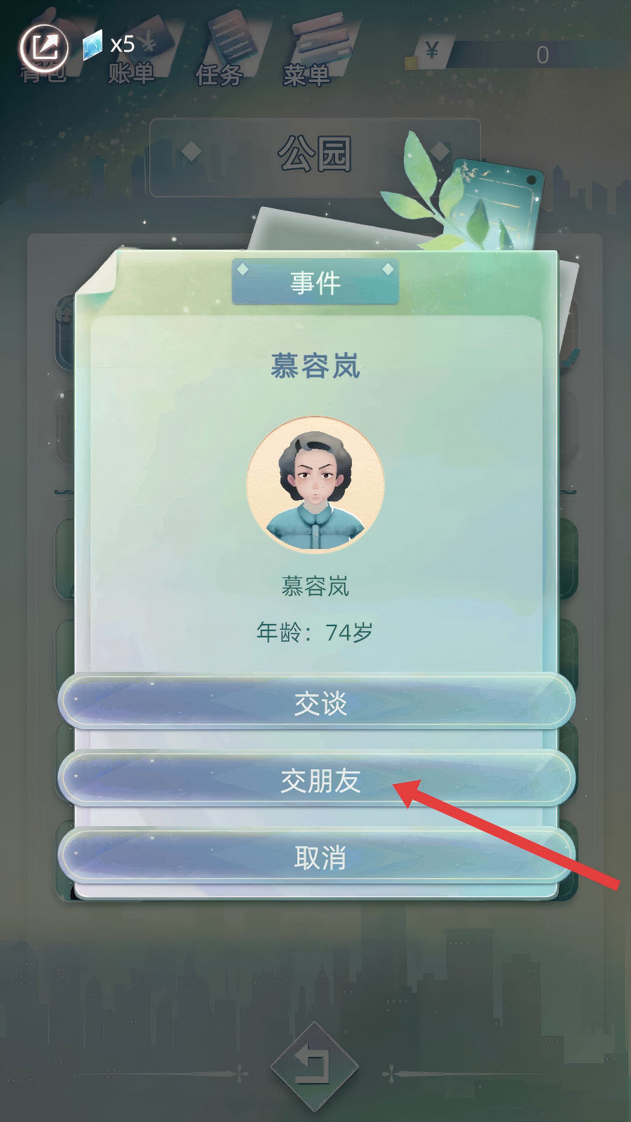 3、觸發(fā)慕容嵐事件后,點(diǎn)擊【交朋友】選項(xiàng),能與她建立友誼關(guān)系,解鎖更多互動(dòng)內(nèi)容與后續(xù)事件,豐富人物關(guān)系網(wǎng)。