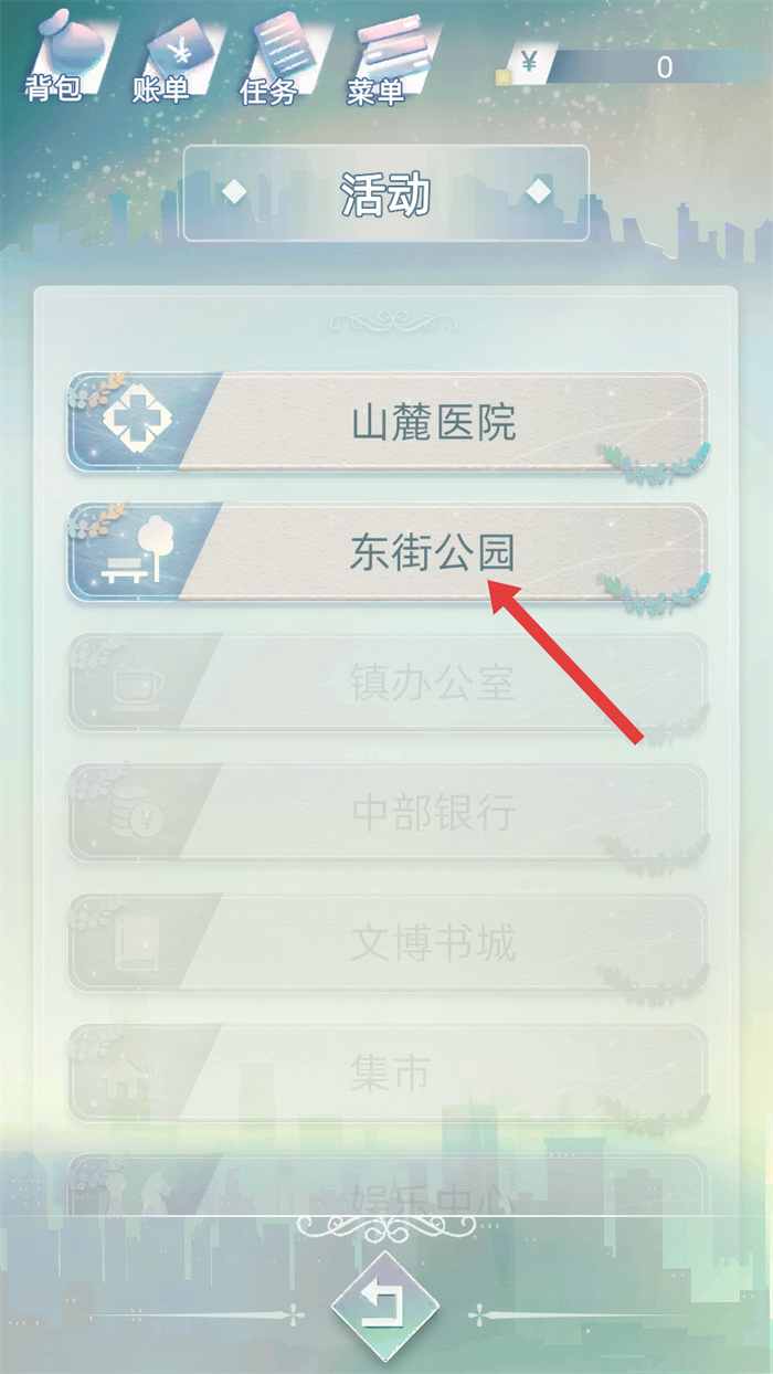 1、進(jìn)入活動(dòng)界面,選擇【東街公園】,可開啟公園區(qū)域的探索,接觸不同場(chǎng)景與人物,推進(jìn)游戲內(nèi)的社交與劇情進(jìn)程。