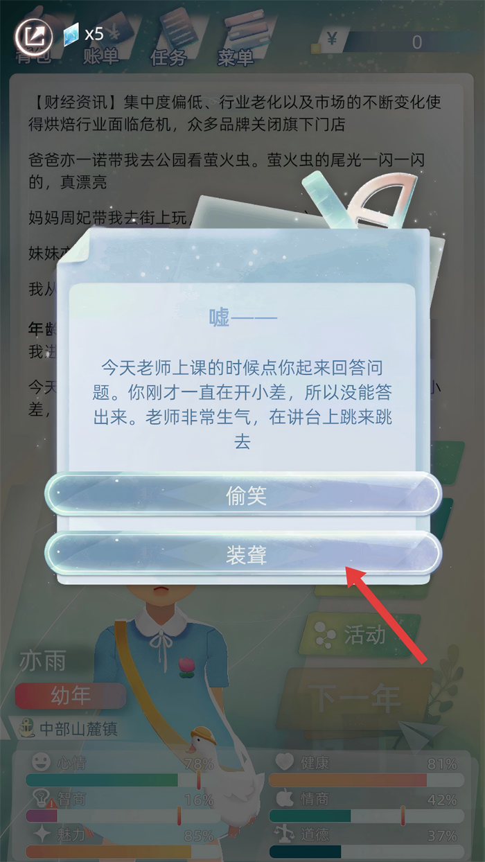 4、遇到課堂開小差被提問(wèn)的事件時(shí),選擇【裝聾】選項(xiàng),可應(yīng)對(duì)該事件,影響角色發(fā)展與劇情走向,每一次選擇都塑造獨(dú)特人生。