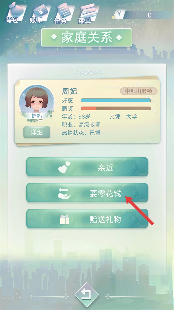1、和家人互動時,點擊【要零花錢】,攢下一些資金,為后續(xù)在游戲里的各種消費和發(fā)展打好基礎哦。