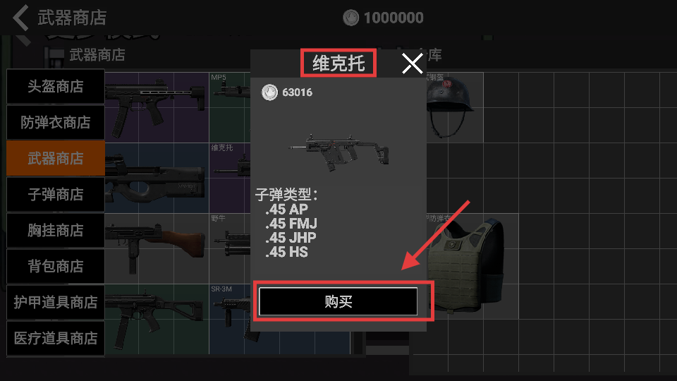 1、在武器商店花費【63016】貨幣購買【維克托】,它支持多種.45子彈,提升戰(zhàn)場戰(zhàn)力。