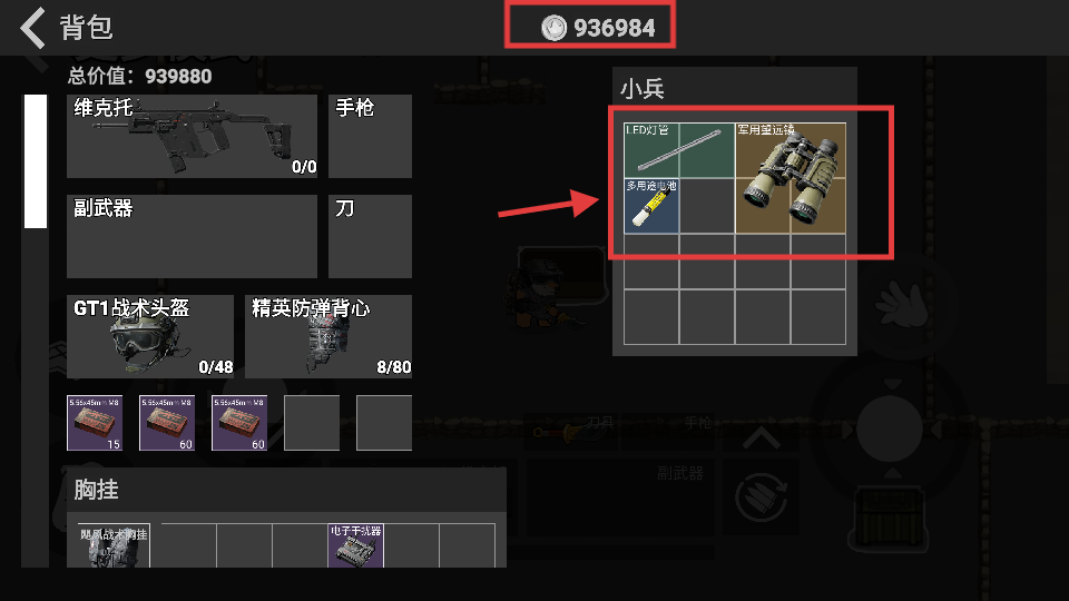 4、收集物資后打開背包,整理【FMJ子彈】【軍用電池】【軍用望遠鏡】等戰(zhàn)利品,保障撤離收益。